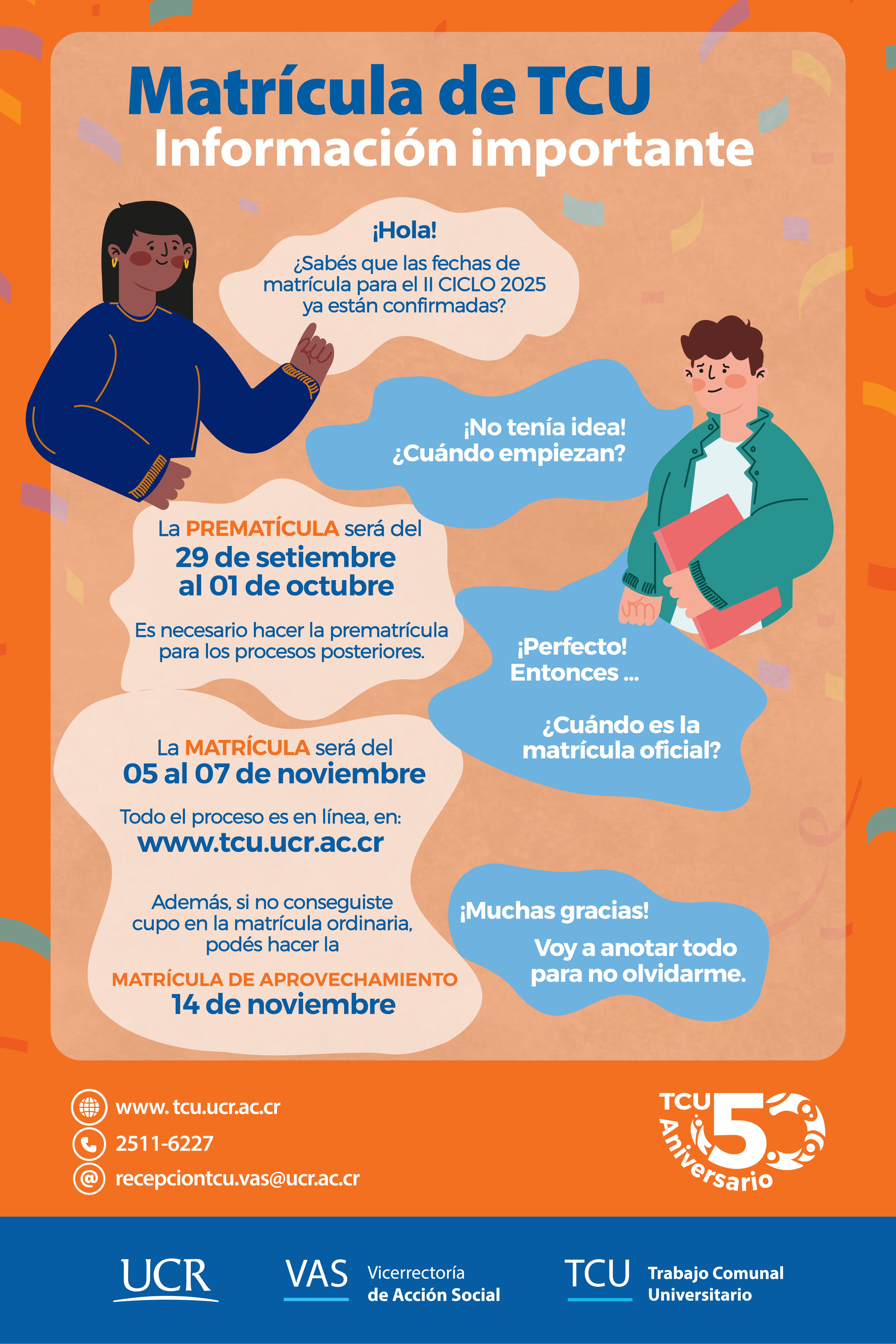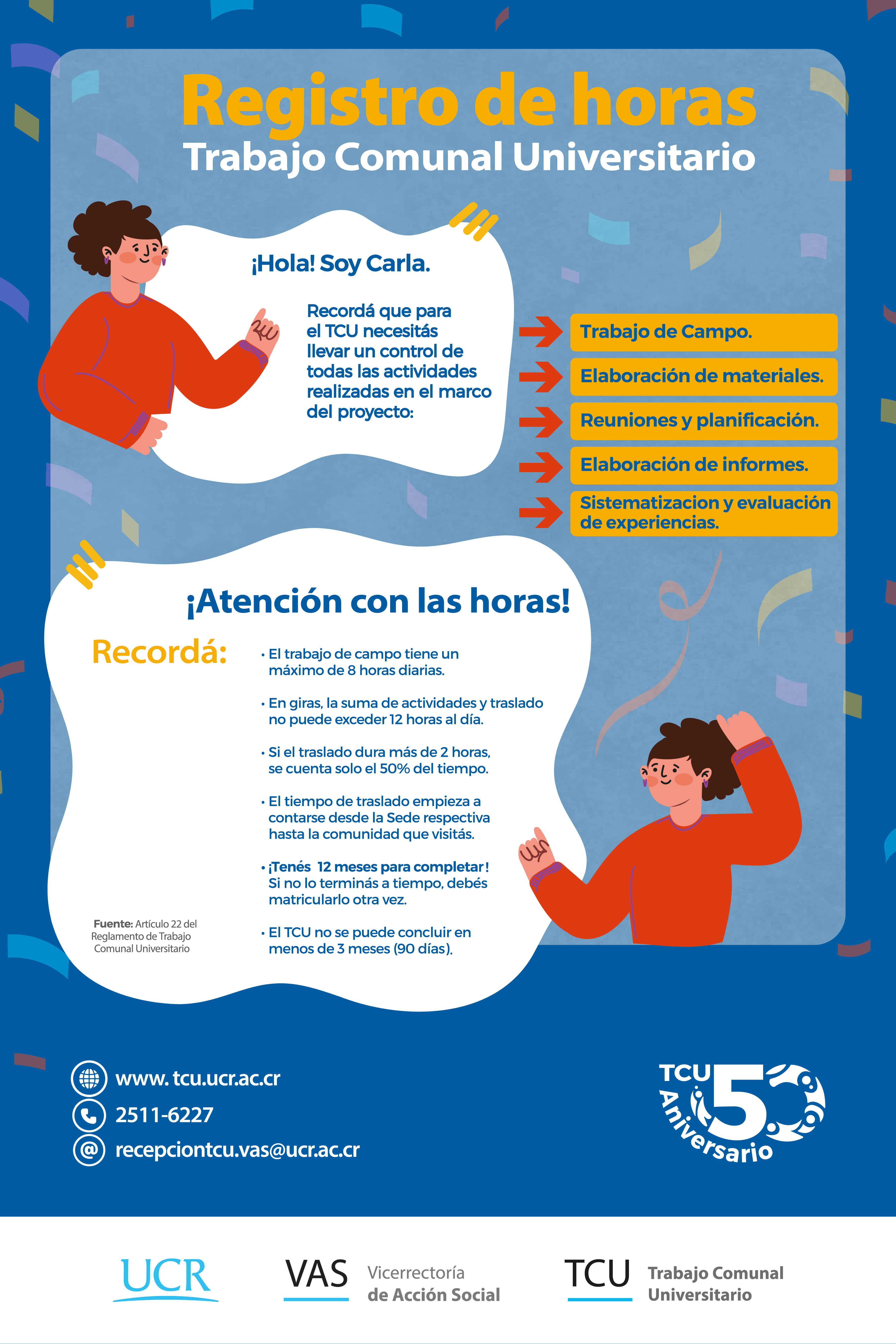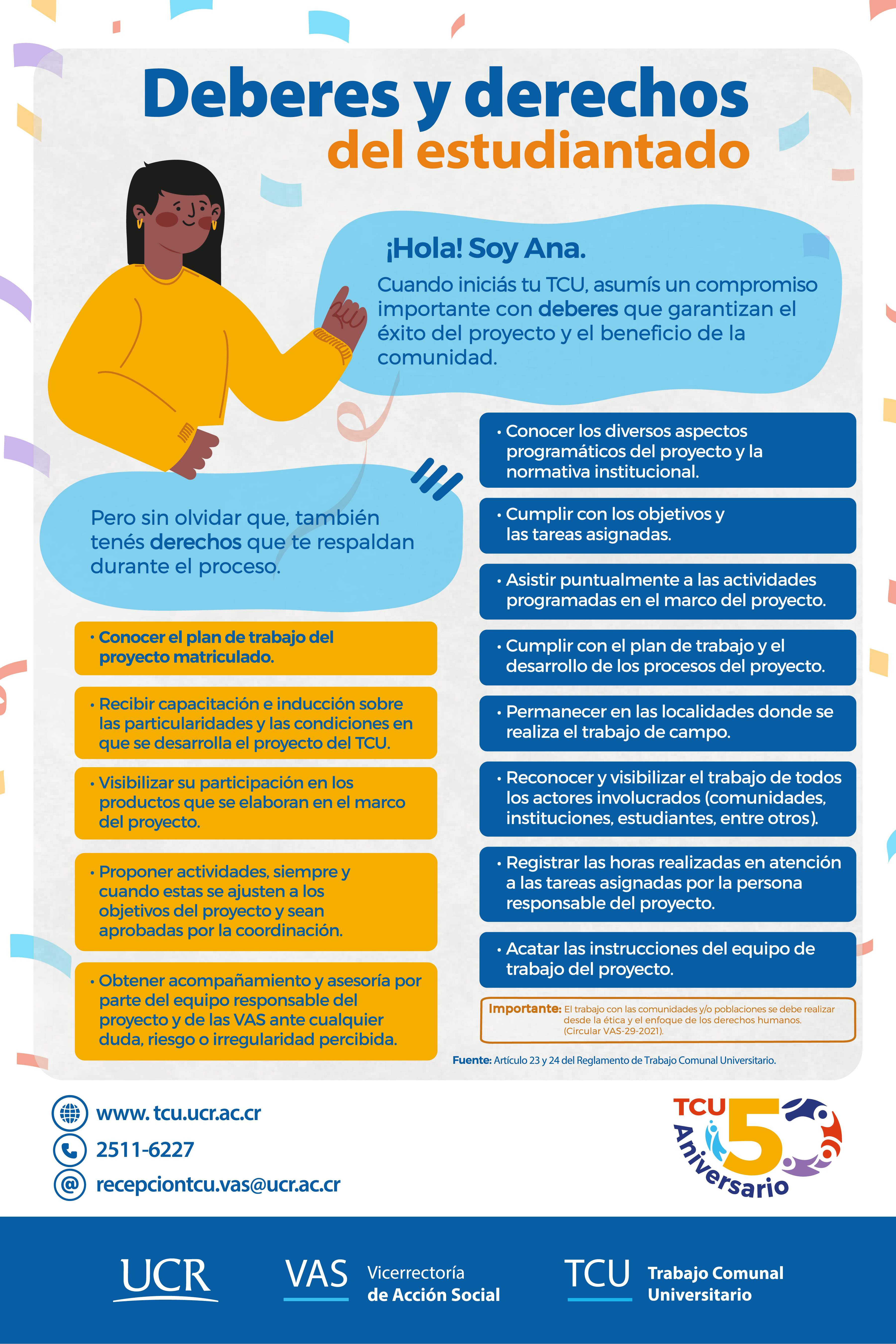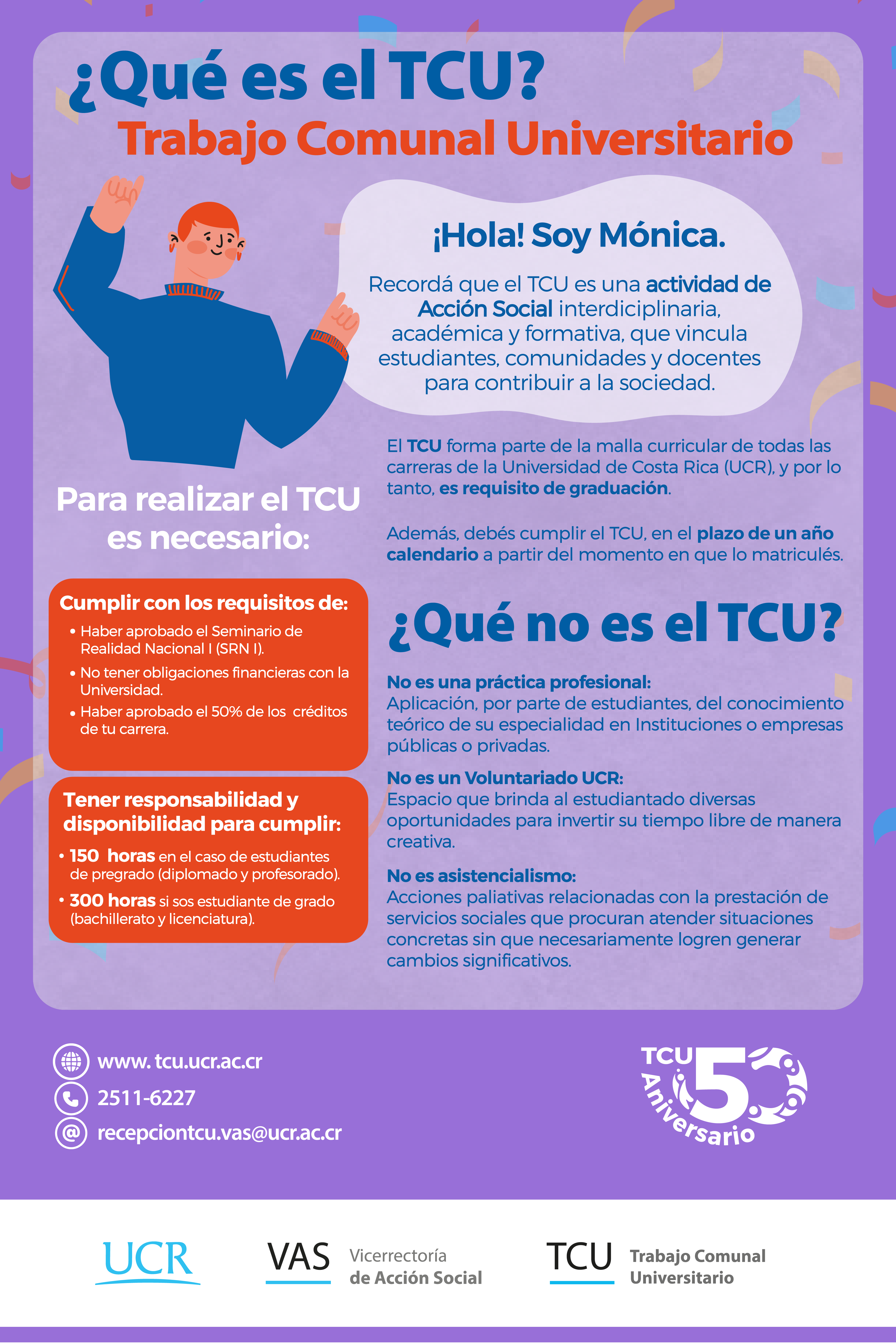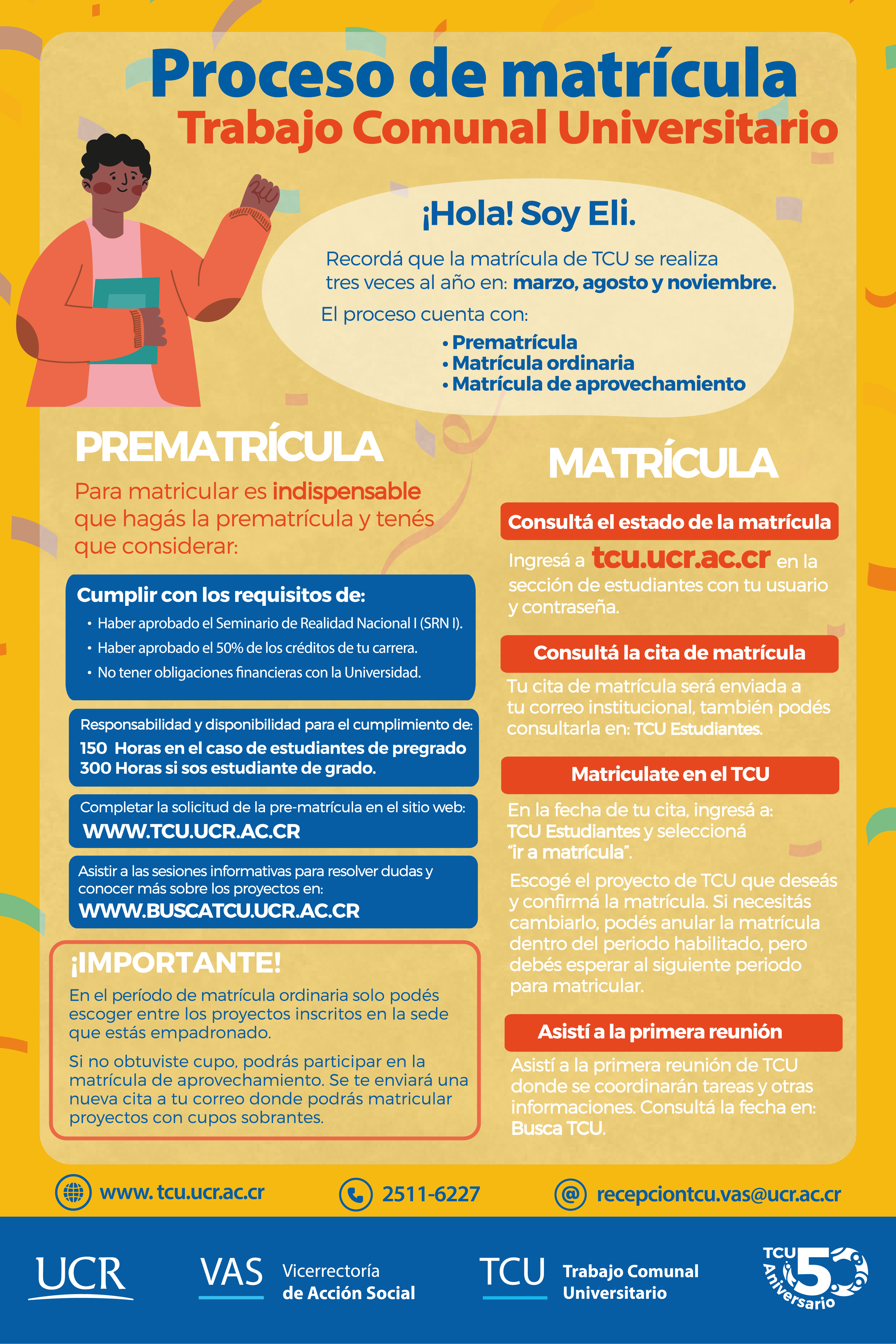 Este material busca brindar información a la población estudiantil de la Universidad de Costa Rica en relación con el Trabajo Comunal Universitario y el proceso de matrícula.